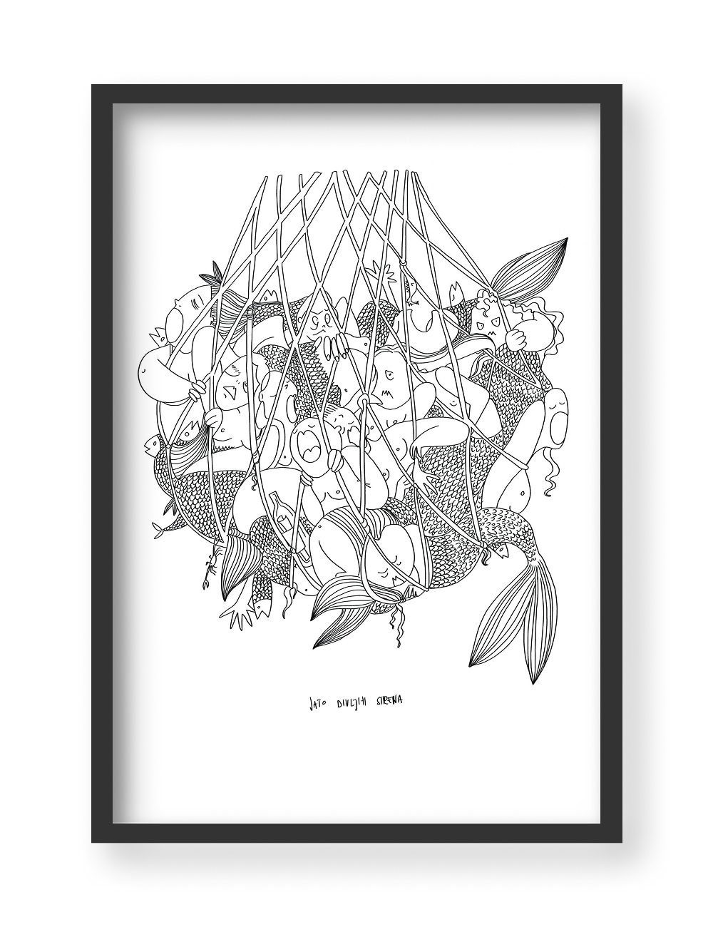 The illustration A School of Wild Mermaids depicts mermaids imprisoned in a net where they blend into a crowded but harmonious composition.