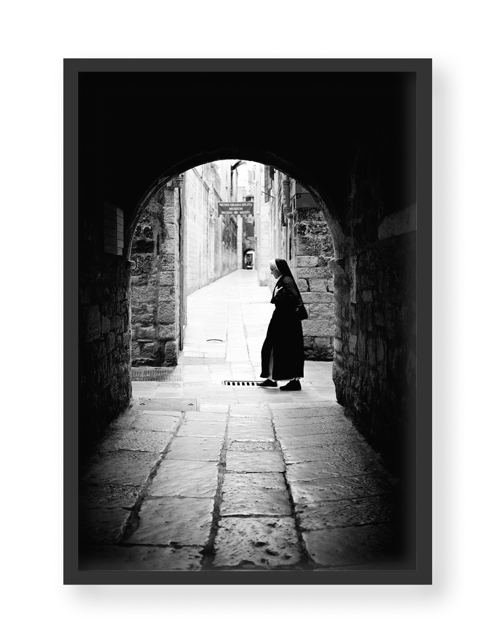 Photographer Mile Modic in this series of analog black-and-white photographs captures the motifs of the old part of the town of Split, recording recognizable faces, places, and situations. In the photo At the End, intense contrasts of black and white add mystique to recognizable locations, making them alluring to every observer.