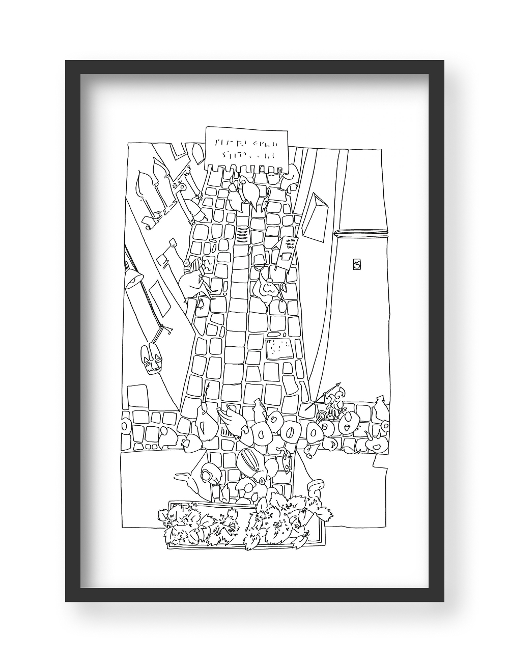 The illustration Crowd in Dominisova Street, shown from a bird’s eye view, depicts an everyday scene in which the characters merge with the old stone street, losing their own identity.