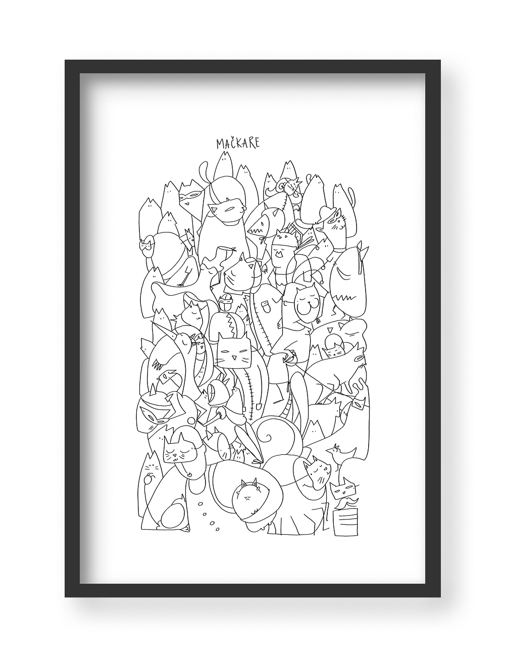 The illustration Crowded (Cat) Carnival is primarily shown from a bird’s eye view, through which each of the characters (cats) loses their own identity as they blend into the crowd.