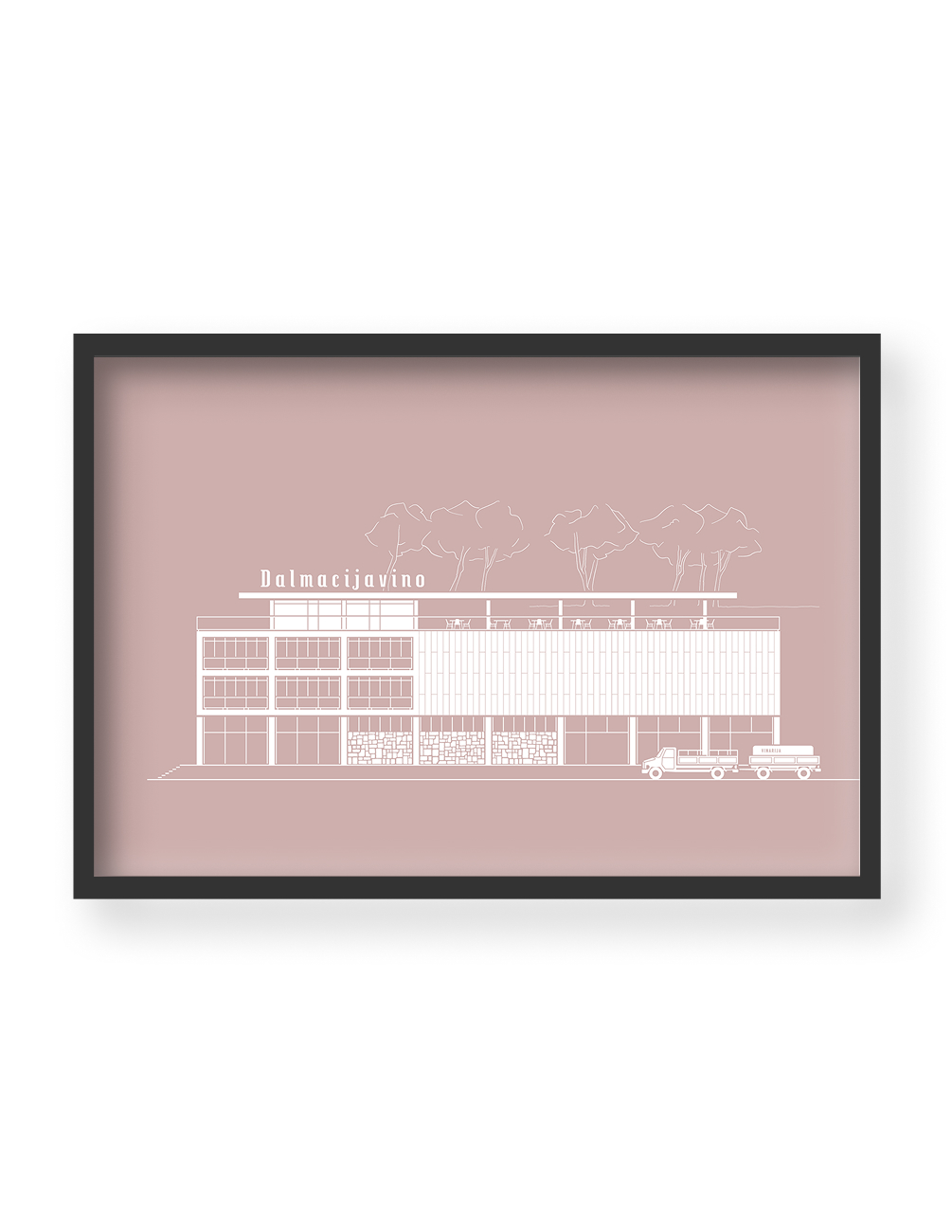 The author’s artwork Dalmacijavino Wine Cellars by Stanko Fabris, shows a neglected factory that was once part f a much larger complex belonging to Dalmacijavino, one of Croatia’s largest wineries. Today, thanks to its location, the ruins of this complex stoically welcome tourists as they disembark from just-docked luxury cruise ships. The choice of pastel colors indicates the fragility of the building and its powerlessness in the face of decay.