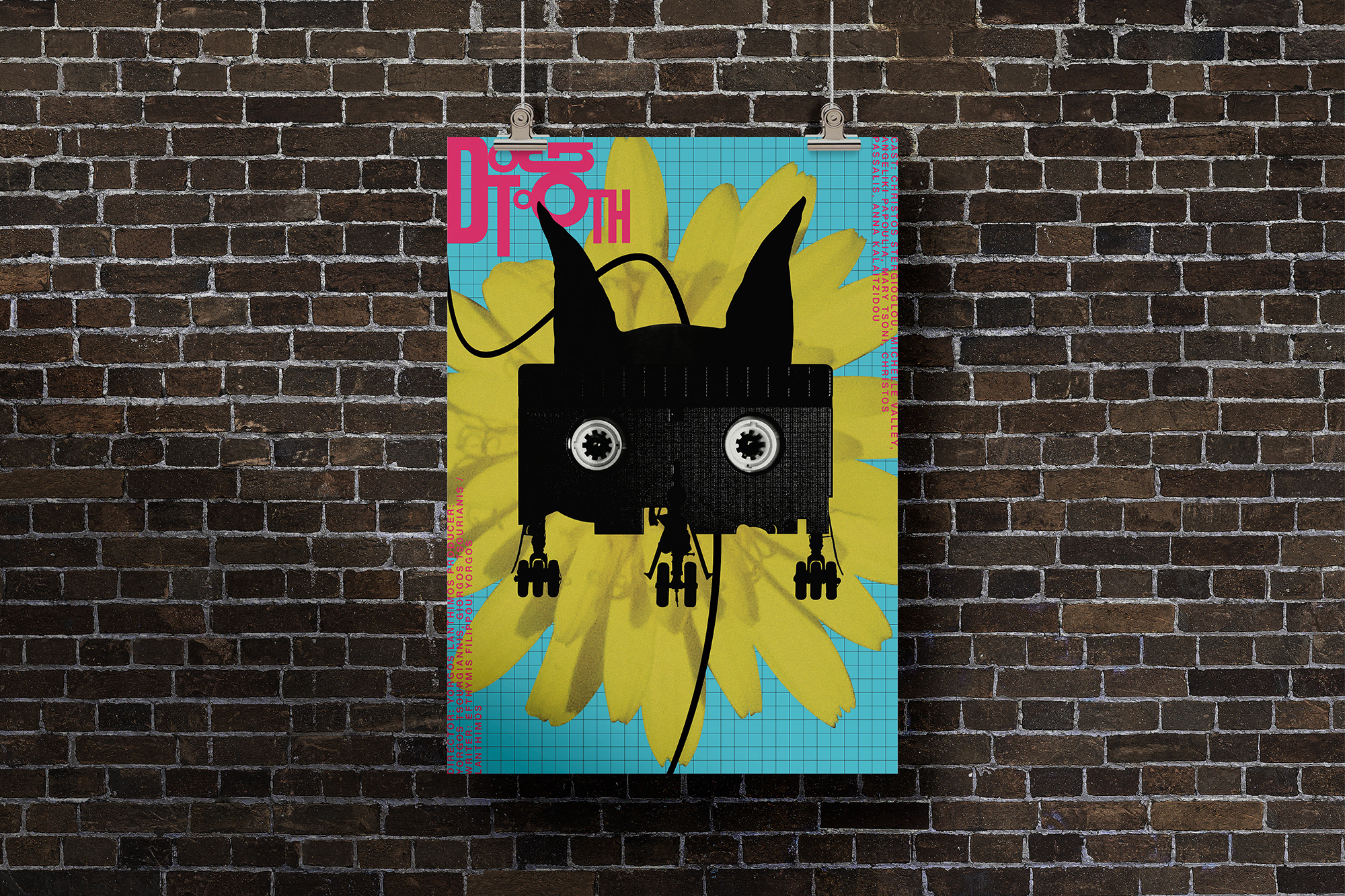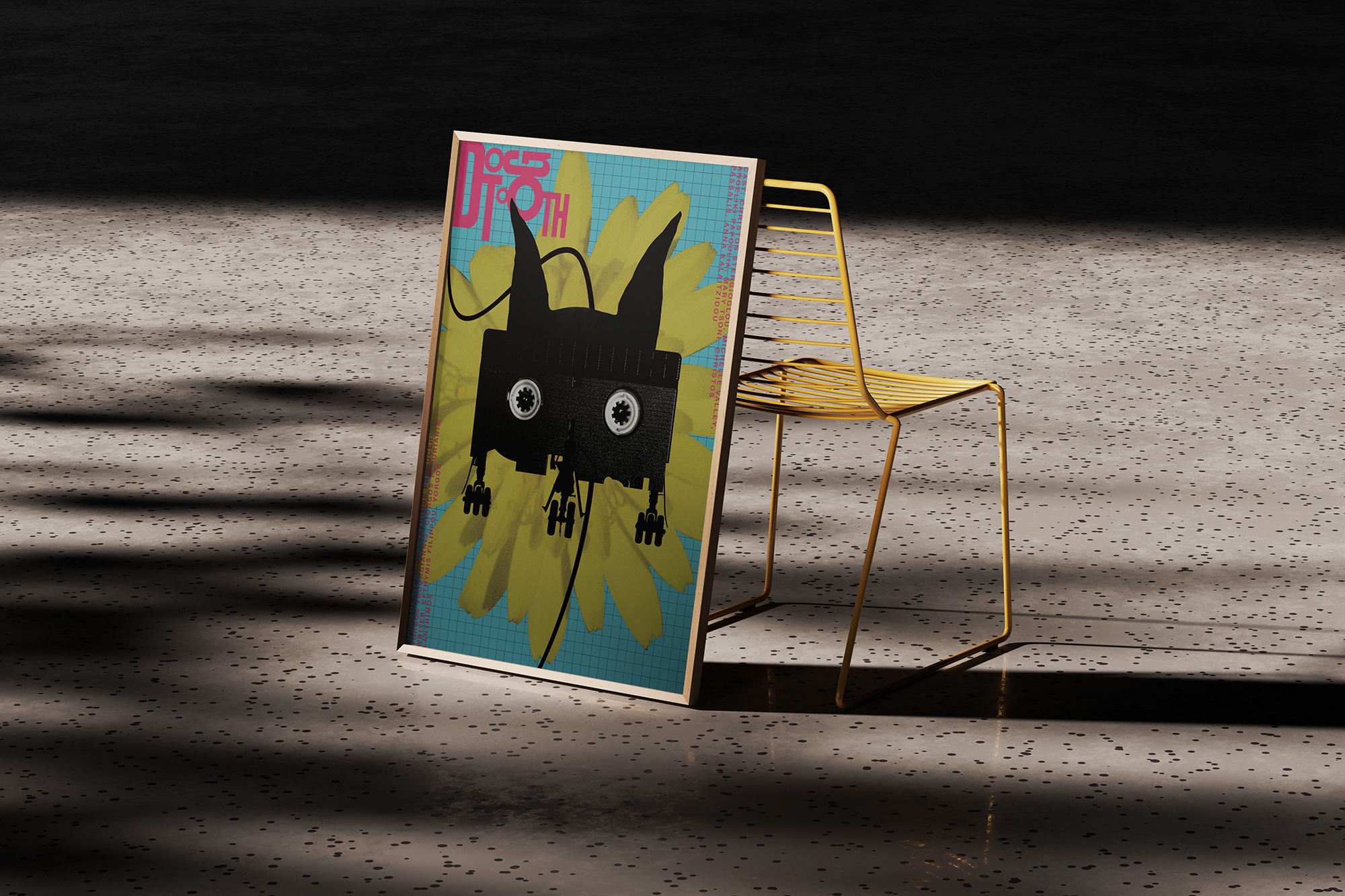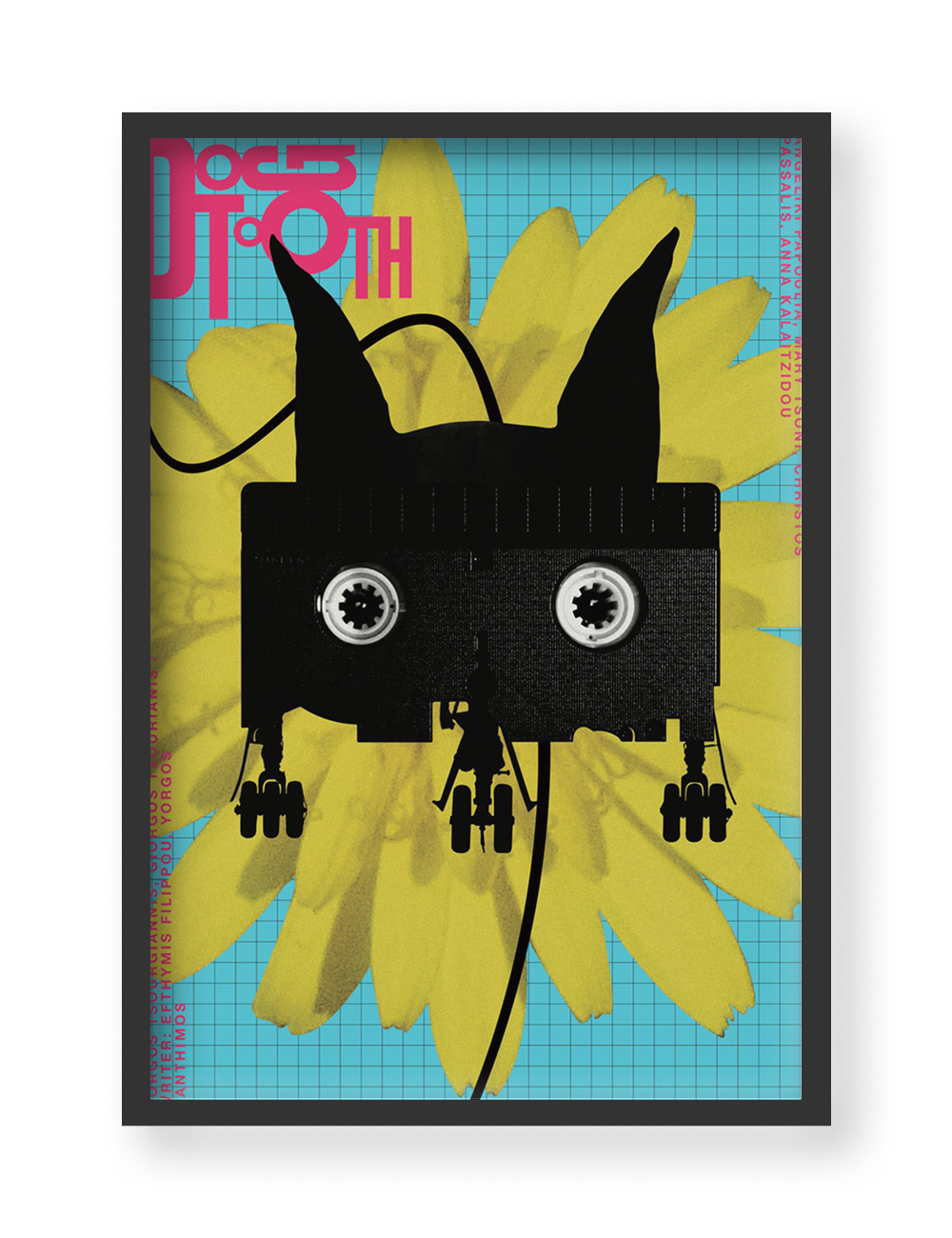 This striking poster by Croatian graphic designer Nikša Vukša offers a clever and surreal take on Yorgos Lanthimos’ cult film Dogtooth (2009). The artist weaves in key symbols from the film—a VHS cassette transformed into a doberman, the silhouette of an airplane, a turquoise grid evoking the family pool, and bright yellow garden flowers—creating a layered image that mirrors the film’s eerie blend of innocence and control. Author’s use of bold color and graphic forms captures the tension between the artificial and the absurd.