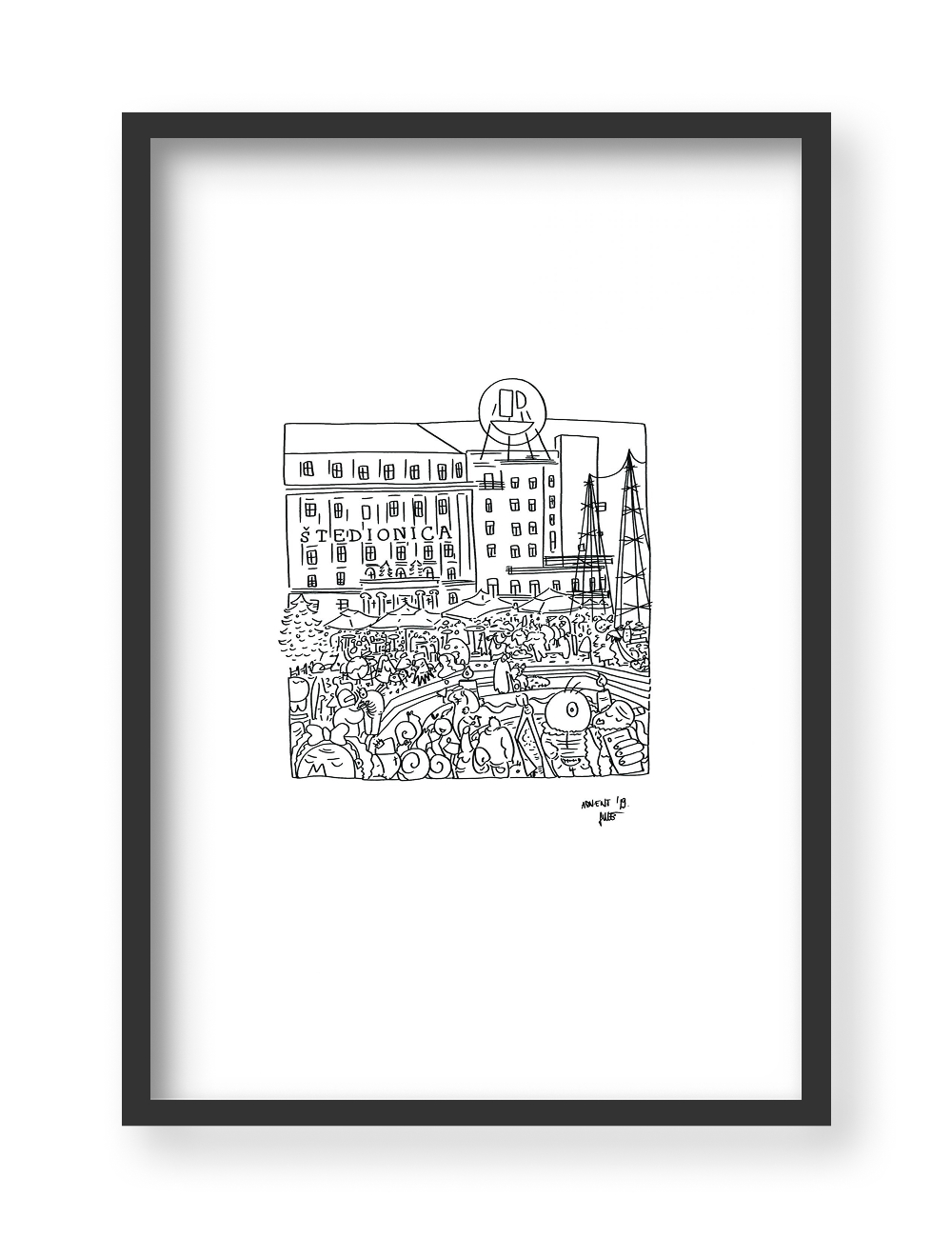 The illustration Savings Bank in Zagreb shows Advent in one of Zagreb’s main squares. In the concoction of Advent happenings, the characters get lost in the crowd, losing their own identity.
