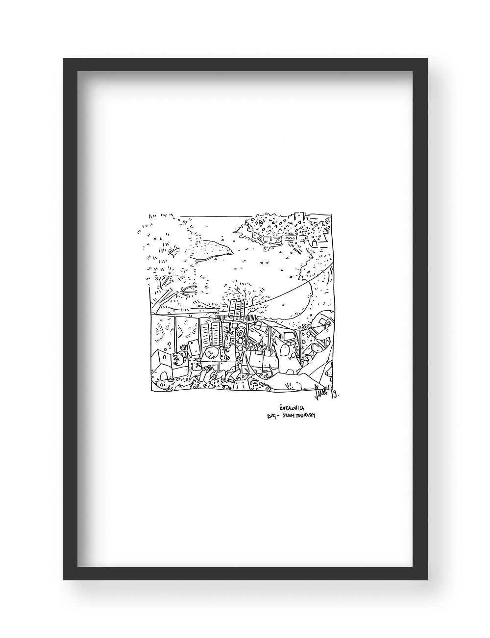 The illustration Slum Dog Tourism in Dubrovnik shows a typical summer day in Dubrovnik, depicted from a terrace on a nearby hill, far away from the chaos of overwhelming seasonal tourism.