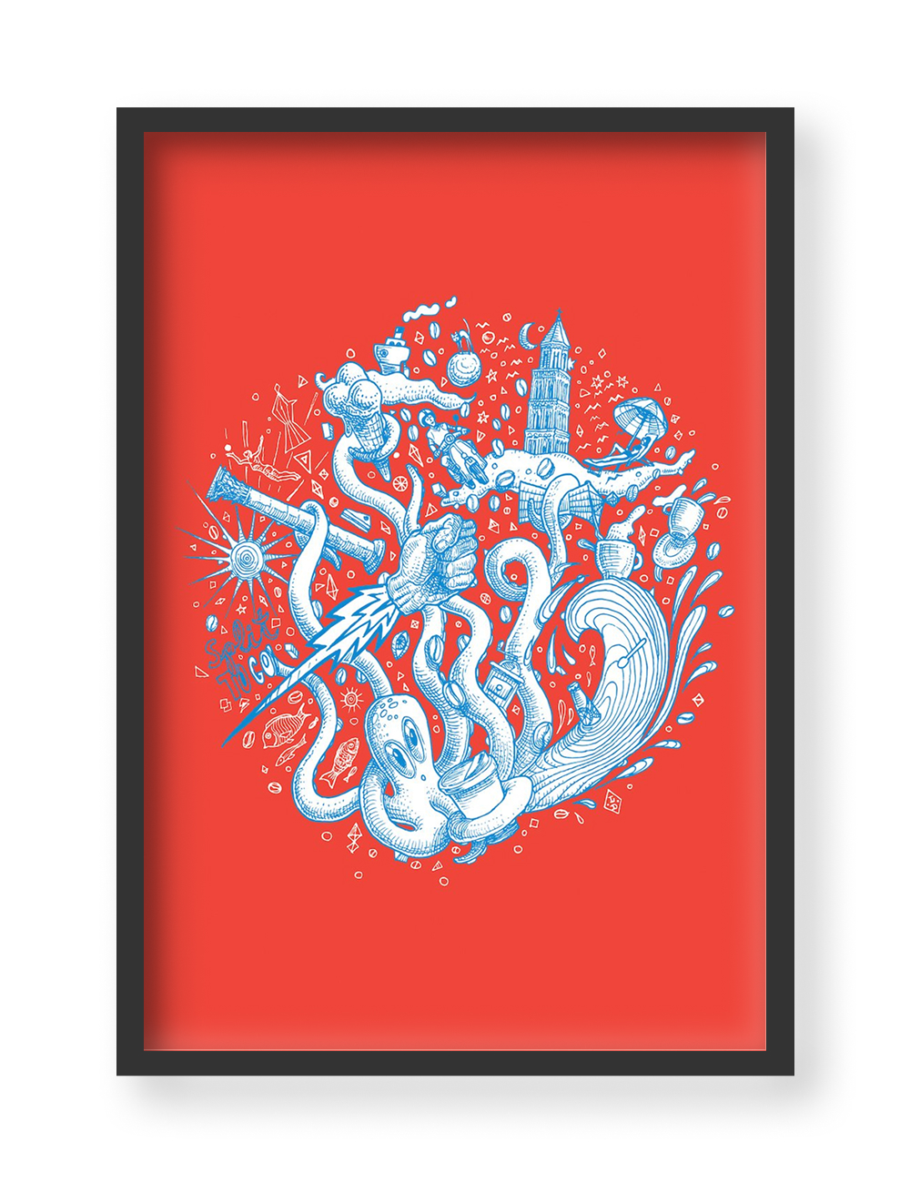 The digital print Split To Go by illustrator Luka Duplančić is a typical example of the author’s illustrative style. Playing with relationships between light and dark, warm and cold, the author uses clear striking images, playing in a witty way with moments of absurdity, humor, and irony.